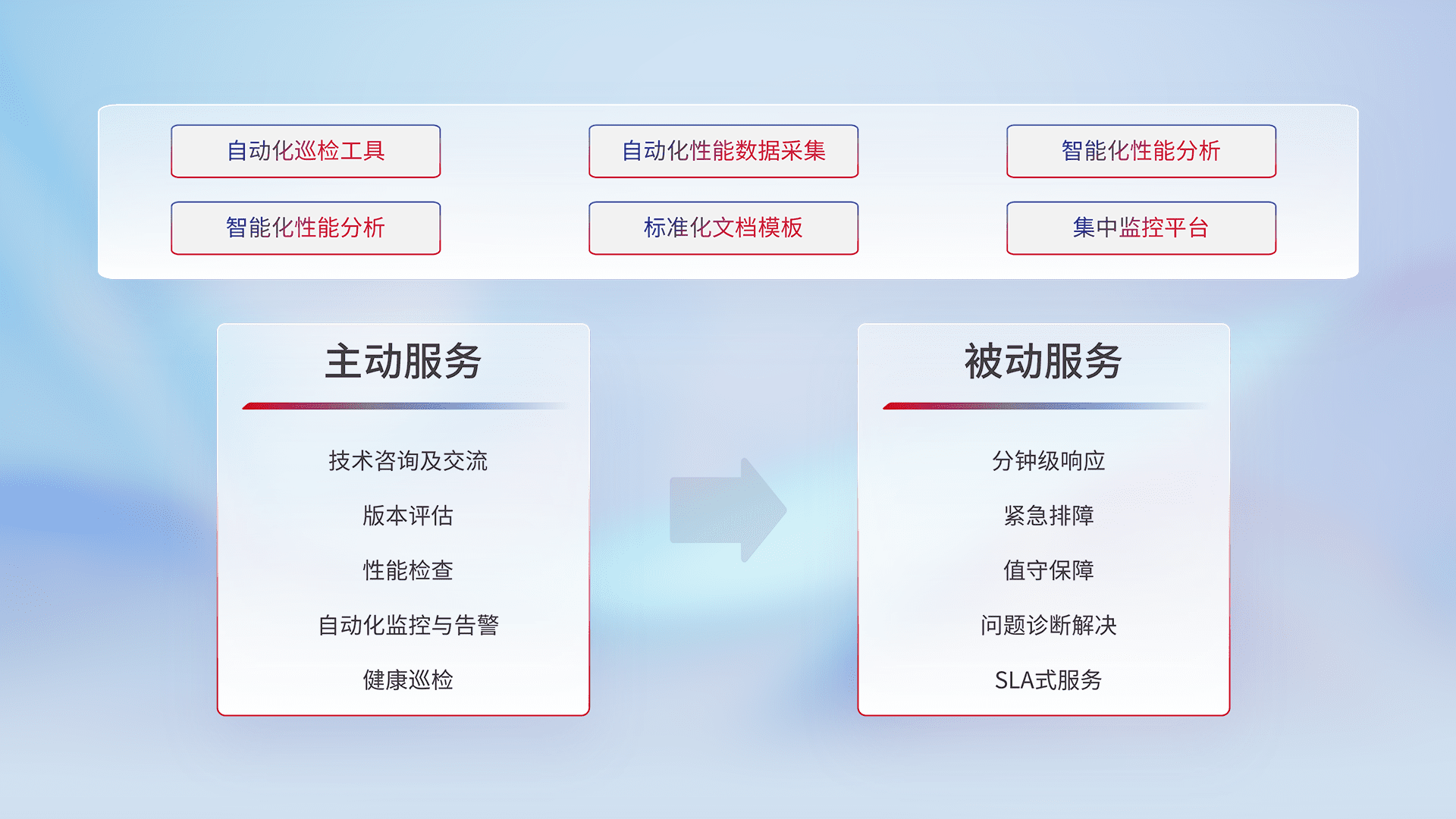 智能化工具和标准化文档,,,保障服务质量,,,,提供主动服务(包含技术咨询、、、、版本评估、、、、性能检查、、、自动化监控与告警、、、、健康巡检)和被动服务包含(分钟级响应、、、紧急排障、、、、值守保障、、、、问题诊断解决、、、、SLA服务)。。。